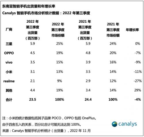 12月2日,市场调研机构Canalys披露的东南亚智能手机市场最新报告显示,由于消费者需求的持续低迷,东南亚智能手机出货量在2022年第三季度同比下降4%,跌至2350万部。该机构指出,这是自2020年以来,该地区的最低水平。