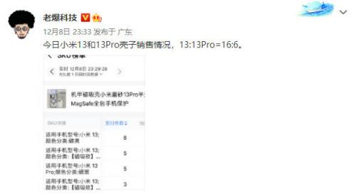 近日,有数码博主公布了小米13系列手机壳的销售情况。根据他的说法,小米13和小米13 Pro的销售占比为16:6。虽然有新机还未开售以及样本较小等影响因素,但相差较大的比例还是能说明一些问题的。此外,该博主在评论中还表示,小米13系列的手机壳销量算不错的。