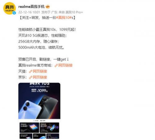 12月16日,真我10系列新成员真我10s正式亮相。该机被官方称为“性能续航小霸王”,搭载天玑810 5G芯片,配备5000mAh大电池,8GB+128GB版售价1099元,8GB+256GB版售价1299元,目前已经开启预售,将于12月20日0点正式开售。购机赠价值99元的耳机一副。