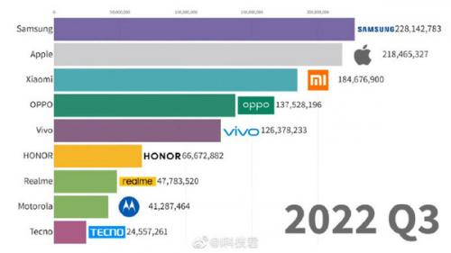 具体来看,2022年7-9月,三星以2.28亿台的销量拿下第一名。紧随其后的是苹果,今年三季度,苹果的销量也突破了2亿台,达到2.18亿台。