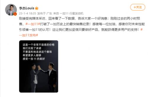 在媒体采访结束后,李杰马上发了一条微博,他公布了一个好消息――一加11打破了一加历史上的最快销售纪录。如此看来,在丢掉利润压力后,3999元的一加11有着十足的杀伤力。