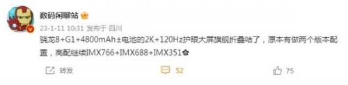 1月11日,据数码博主@数码闲聊站爆料,华为Mate X3可能会延后发布,它原本有两个版本配置,其中高配继续使用IMX766+IMX688+IMX351,核心的配置为骁龙8+G1+4800mAh电池+2K+120Hz护眼大屏。