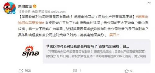 1月15日消息,有投资者在互动平台向德赛电池提问:贵公司前五大下游客户集中度较高,第一大下游客户为苹果,近期苹果因需求疲软砍单对贵公司经营的是否有影响?具体影响程度和贵公司应对策略?对此,德赛电池回复称,目前公司生产经营情况正常,与各主要客户商务合作良好。