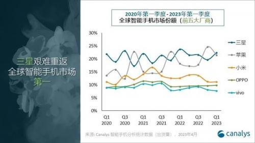 2020年第一季度-2023年第一季度全球智能手机市场份额(前五大厂商)