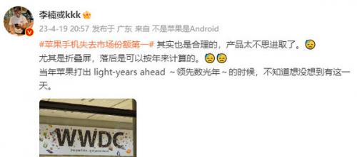 据悉,李楠借近日大火的#苹果手机失去市场份额第一#话题称,其实这是合理的,产品太不思进取了。他表示,尤其在折叠屏手机领域,苹果落后是可以按年来计算的。当年苹果打出“light-years ahead领先数光年”的时候,不知道想没想到有这一天。有网友表示,先不论苹果在折叠屏手机领域的技术实力,就产品而言,安卓阵营的确已经做到领先。对比之下,苹果的折叠屏手机还不知道什么时候会发布。