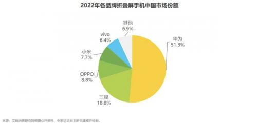 就拿华为来说,由于其在折叠屏市场布局早,而且拥有强大的技术支撑,目前为止已经做到四年更新七代产品,从Mate X一直到前不久刚刚发布的Mate X3,产品形态覆盖了外折、内折、竖折多种形态,是目前厂商里唯一做到全折叠形态的品牌,这无疑为用户提供了多重选择。当然,市场反馈最能说明华为在折叠屏市场的统治力,根据艾瑞消费市场研究院数据,2022年各品牌折叠屏手机中国市场份额,华为实现了断层式的领先,份额高达51.3%。而随着华为在折叠屏产品上的不断攻坚克难,这一份额有望进一步提升。