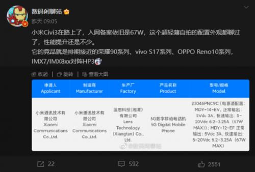 通过图片来看,小米Civi 3的设备型号为23046PNC9C,该产品于今年4月拿到了3C入网许可。该机支持67W快充,与小米Civi系列相符。