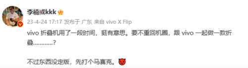 4月24日,曾担任魅族科技高级副总裁、魅蓝品牌总裁等职务,但是最终却离开魅族科技,现Angry Miao创始人李楠发文表示:“vivo折叠机用了一段时间,挺有意思。要不重回机圈,跟vivo一起做一款折叠…………?不过东西没定版,先打个马赛克。”