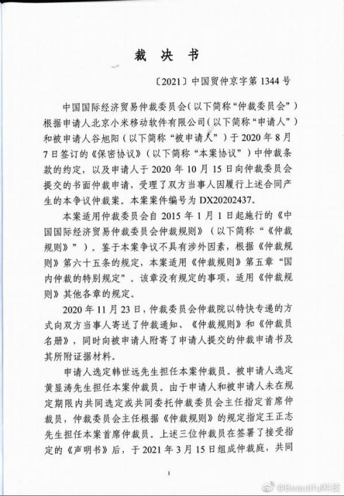 根据该博主晒出的中国国际经济贸易仲裁委仲裁书,Beautiful科技负责人谷旭阳需向小米公司支付违约金100万元。