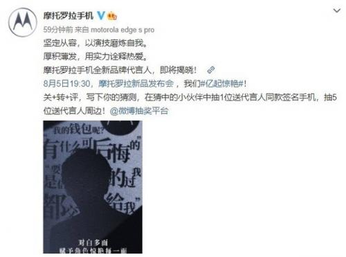 摩托罗拉新品发布会定档8月5日,现在距离这个日子只有3天时间了。随着发布会时间的临近,8月2日,摩托罗拉官方宣布,将于8月5日公布摩托罗拉手机全新品牌代言人!