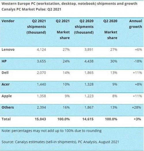 据Canalys称,苹果公司正继续受益于西欧对Mac和iPad的高需求,随着各国从COVID-19中恢复过来,继续接受远程工作,其出货量也在上升。Canalys的分析师称,西欧的个人电脑市场连续第五个季度继续实现同比增长。虽然2021年第二季度同比增长3%至1500万台并不算明显的突破,但它至少延续了整个行业一年来的高增长趋势。