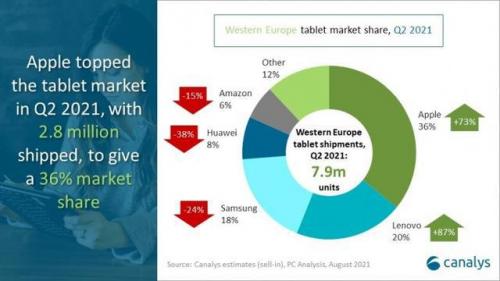 据称,最新的搭载M1的iPad Pro"在西欧受到热烈欢迎"。苹果的增长并不是主要供应商中最高的,联想在这一时期有着有87%的增长,使其以20%的市场份额位居第二。然而,这与三星、华为和亚马逊形成了鲜明的对比,它们的出货量分别同比下降了24%、38%和15%。