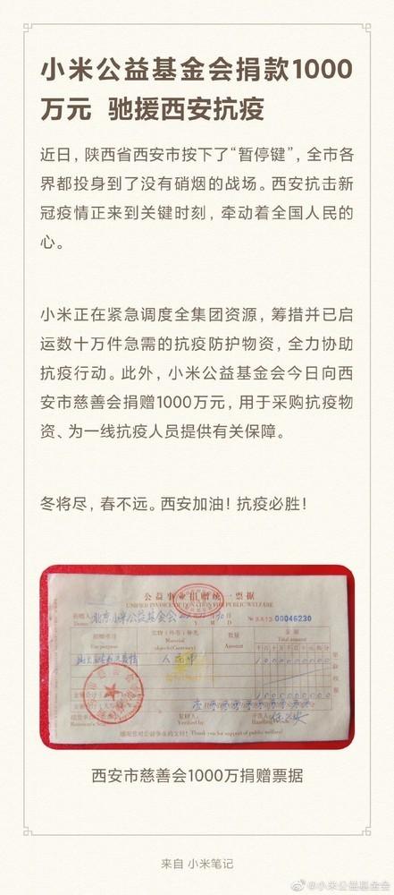 疫情无情人有情!小米公益基金会向西安捐款1000万元