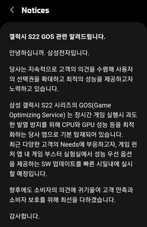 对于这一事件,三星回应解释了网友声称的“GOS限制性能”这一事情,其表示三星这么做的目的是为了避免手机在长时间运行游戏后出现过热的现象,决定通过对芯片CPU和GPU进行调度来降低手机温度。不过三星在声明中同时表示,在收到了众多拥护提出的意见后,其为满足最近各种客户的需求,计划近期推送软件更新,为客户提供“性能优先”的选项。三星还表示,会持续聆听客户的意见和反馈,为客户满意尽最大努力。
