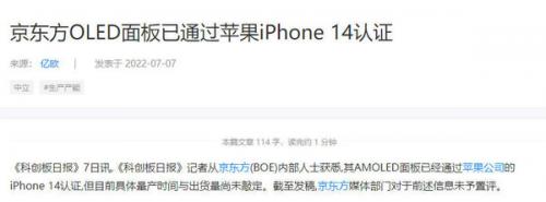 7月7日,手机中国了解到,《科创板日报》记者从京东方(BOE)内部人士获悉,其AMOLED面板已经通过苹果公司的iPhone 14认证,但目前具体量产时间与出货量尚未敲定。