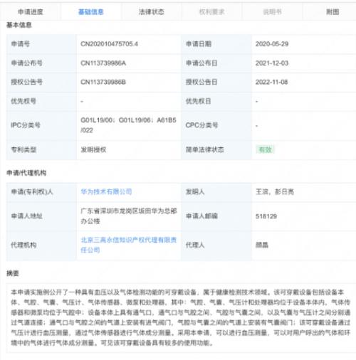 根据企查查APP显示,华为技术有限公司申请的“具有血压以及气体检测功能的可穿戴设备”专利获授权。其中专利摘要显示,本申请属于健康检测技术领域,该可穿戴设备包括设备本体、气腔、气囊、气压计、气体传感器、微泵和处理器,其中:气腔、气囊、气压计和处理器均位于设备本体内,气体传感器和微泵均位于气腔中;设备本体上具有通气口,通气口与气腔之间、气腔与气囊之间,以及气囊与气压计之间分别通过气道连接;通气口与气腔之间的气道上安装有进气阀门,气腔与气囊之间的气道上安装有气囊阀门;该可穿戴设备通过气压计进行血压测量,通过气体传感器进行气体成分测量。采用本申请,可以进行血压测量,可以对用户呼出的气体和环境中的气体进行气体成分测量。
