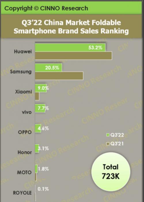 厂商排名方面,华为、三星、小米、vivo、OPPO、荣耀和摩托罗拉是排名前七品牌。其中,华为一家厂商就占据了高达53%的市场份额,比其他所有厂商加起来都多,这足见华为折叠屏手机有多么受到消费者的喜爱。