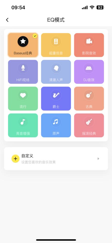 多达12种EQ模式切换,可以按照音乐风格,类型等寻找你满意的EQ模式播放音乐。另外,如果这十二种模式还不能满足你,那么你还可以在下方利用均衡器设置自定义音效,打造专属于自己的音效体验。