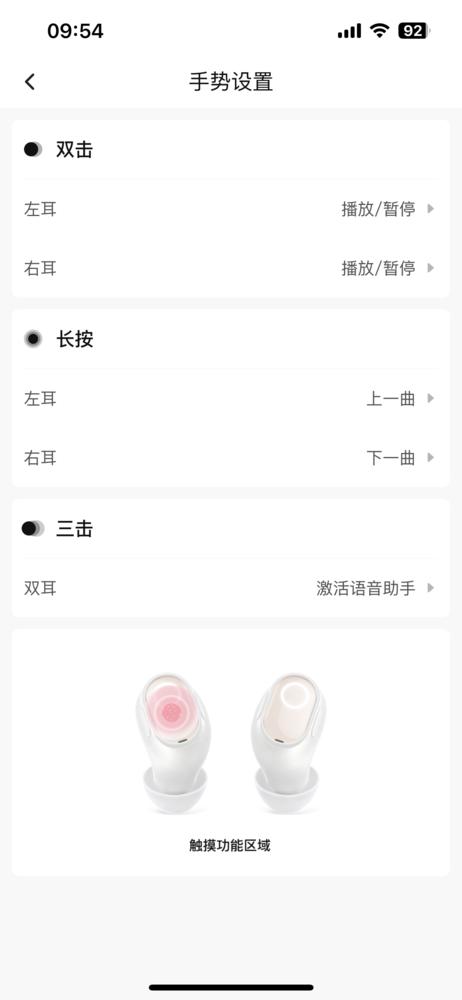 APP内还可以自定义触控功能手势,自由设置符合自己使用习惯的私人耳机。比如,双击左右耳可实现播放/暂停、长按1.5秒左耳是上一曲,反之则是下一曲、双击左耳或右耳则可以实现接听/挂断等操作。