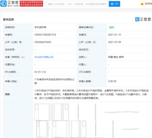 企查查APP显示,近日,华为技术有限公司公开一项名为“手机保护壳”的专利,公开号为CN306667045S,申请日期2021年1月。企查查专利摘要显示本外观设计产品的设计要点在于产品的形状.此外,摘要附图显示,该手机壳样式为翻盖式,可充当手机支架。