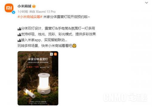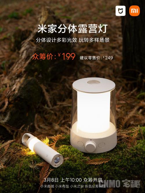 3月6日,小米商城官方宣布,小米商城众筹新品米家分体露营灯开启预约!该露营灯采用分体双灯设计,露营灯&手电筒&氛围灯一灯多用;支持呼吸、烛光、流彩、彩光模式;主灯采用大容量锂电池,续航时间长达100小时;并可接入米家app,实现智能联动,众筹价199元。