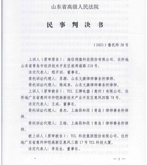 一审判决后,海信视像、TCL王牌电器公司均不服判决,双双上诉至山东省高院,并补充提交了相关证据。