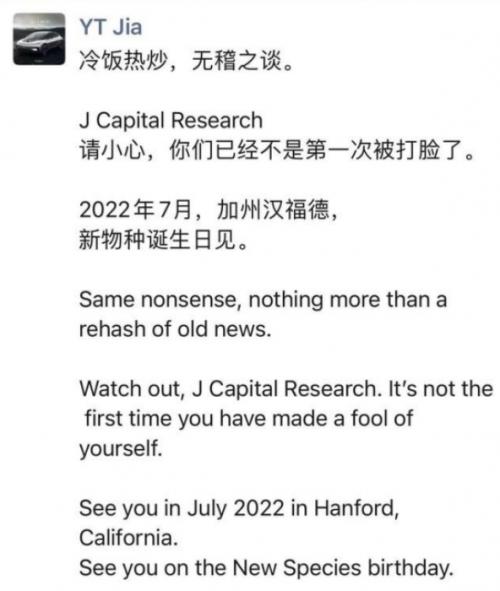 面对J Capital Research的尖锐言论,贾跃亭也做出回应:“冷饭热炒,无稽之谈。J Capital Research你们已经不是第一次被打脸了。2022年7月,加州汉福德,新物种诞生日见。”此外,贾跃亭表示将在未来12个月内大幅扩充员工人数,2022年交付FF 91。
