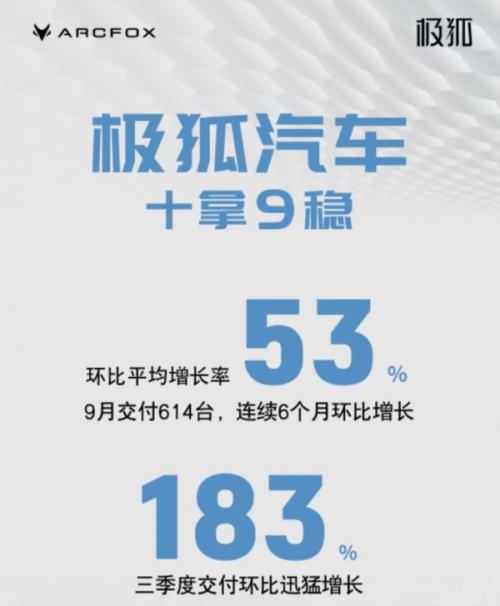在造车新势力中,极狐汽车是追求极致性能与创新设计的高端智能新能源汽车品牌。2021年4月,ARCFOX极狐阿尔法S华为HI版正式发布,由极狐与华为联合开发,首个量产搭载华为全栈智能汽车解决方案。近日,极狐汽车公布最新销量数据,9月交付量为614台,环比平均增长率为53%,连续6个月环比增长,三季度交付环比增长183%。
