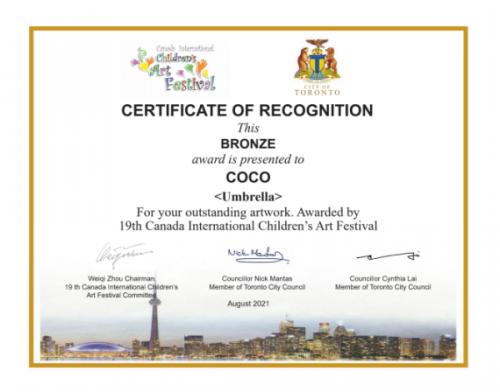 当艺术节评委得知这一消息时也颇感意,评委们表示:“我们就是正常地按照小朋友的智力和艺术水平去做评价,没有搞特殊化。这幅作品的创意、构图、色彩和表达方式,都已达到铜奖水平。”据介绍,小可的获奖作品《Umbrella》表达了与全世界小朋友一起爱护环境、保护地球,为共同拥有和谐生活而努力的美好愿望,这正与本届加拿大国际儿童艺术节的举办宗旨不谋而合。在创作中,小可采用了现代拼贴艺术这一“20世纪最富有灵性和活力的”艺术形式,将多样的颜色、线条和图案组合,通过拼贴技巧呈现出来,线条简洁明快,富有童真童趣,表达着她脑海中无拘无束的想象。