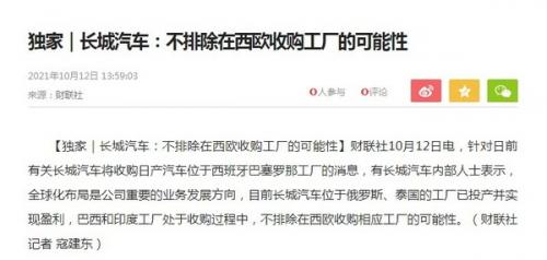 根据财联社的独家消息,针对上述传闻,有长城汽车内部人士表示,不排除长城汽车会在西欧收购相应工厂的可能性。该人士还表示,全球化布局是长城汽车重要的业务发展方向,目前长城汽车位于俄罗斯、泰国的工厂已投产并实现盈利,巴西和印度工厂也处于收购过程中。