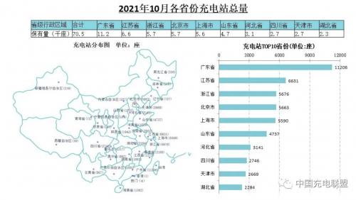 10月各省份公共充电站总量TOP10和充电桩的排行有所不同,广东依然占据第一,公共充电站保有量为1.12万座,排在第二和第三的是江苏省和浙江省。据悉,2021年10月全国充电总电量约10.15亿kWh,同比增长42.5%;同时10月比9月公共充电桩增加1.80万台,同比增长59.4%。