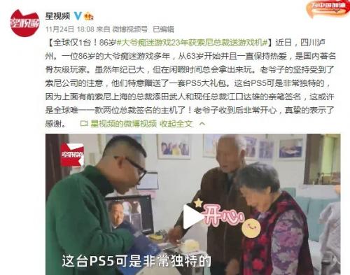 11月25日消息,据报道,四川泸州一位86岁的大爷近日收到了一份特殊的礼物――一套PS5大礼包,其中PS5主机上还有前索尼上海的总裁添田武人和现任总裁江口达雄的亲笔签名,它可以说是全球唯一一款拥有两位总裁签名的主机。
