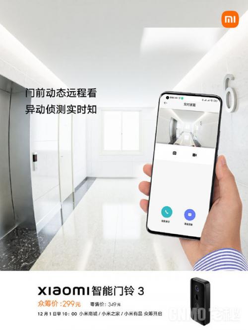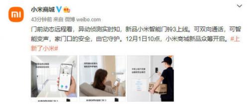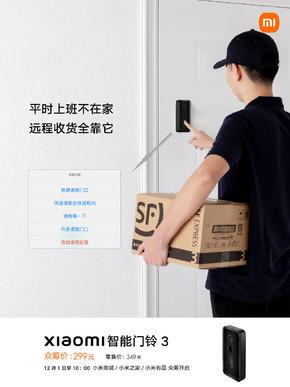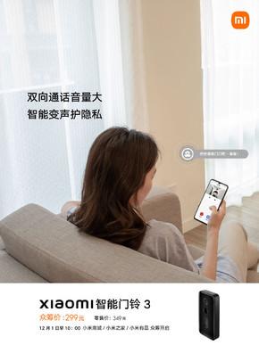 “门前动态远程看,异动侦测实时知。”11月29日,小米商城宣布,新品小米智能门铃3上线!可双向通话,可智能变声,零售价349元,众筹价299元,将于12月1日10点正式开启众筹。