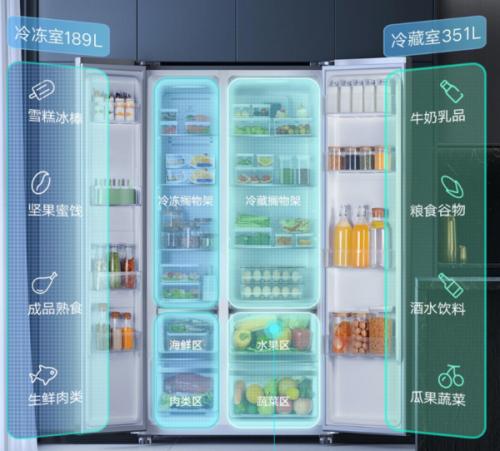 该冰箱共有540L大容量,其中冷冻室为189L,冷藏室为351L,内置抗菌装置,含有大量银离子,可有效抑制细菌滋生,延长食材保鲜周期,抗菌率达99.99%,净味率达90.6%;采用360°环抱立体送风,可带来更快的制冷速度,避免凝露结霜;内置4枚温度传感器,共有智能模式、速冷模式、速冻模式、假日模式等多种模式,用户可按需选择。