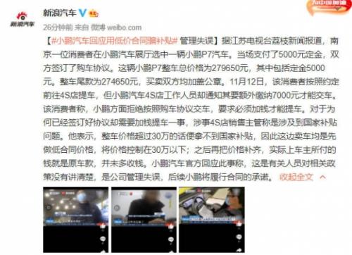 12月8日,据报道小鹏汽车官方回应称,这是有关人员对相关政策没有讲清楚,是公司管理失误,后续小鹏将履行合同的承诺。