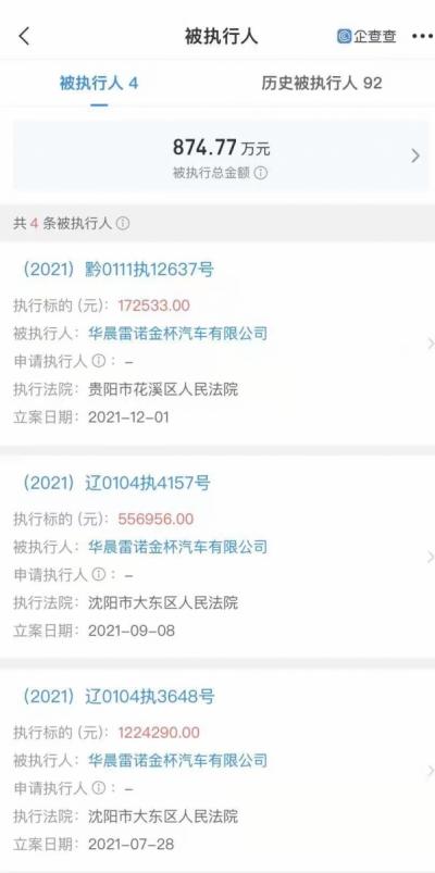 华晨雷诺金杯4条被执行信息总额达874.77万元