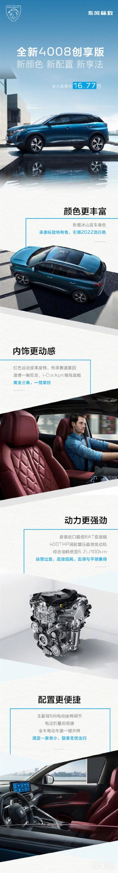 配置上,全新4008创享版新增了2022时尚风靡色调――冰山蓝车色,“冰雪冷峻的同时,还有海风般的清新和湖水般的透彻”,让视界焕然一新。此外,新车还新增了红色运动皮革座椅,传承品牌赛道基因。并新增了副驾驶电动座椅、电动折叠后视镜与全车电动车车窗一键升级,可满足全家出行需求。