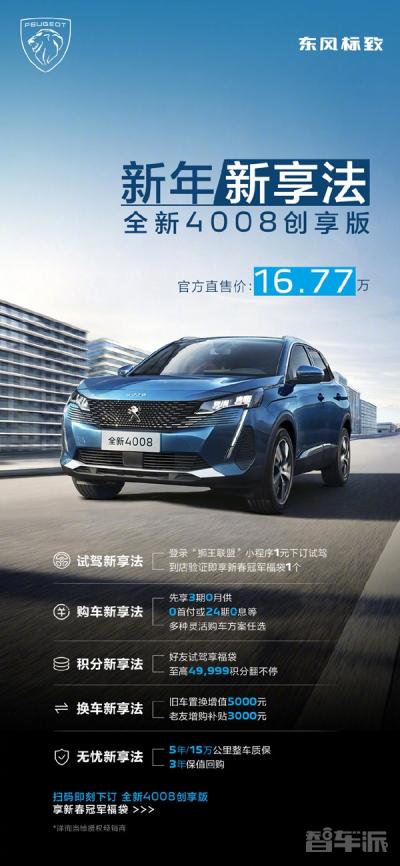 1月7日,东风标致宣布全新4008创享版上市,官方直售价16.77万元。现在下订购买新车可享5重好礼,包括1元下单试驾、到店验证即享新春冠军福袋1个;有3期0月供、0首付或24期0息等多种灵活购车方案可选;好友试驾享福袋,最高49999积分翻不停;旧车置换增值5000元,老友增购补贴3000元;5年/15万公里整车质保以及3年保值回购。