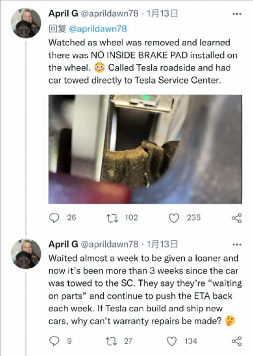 近日,海外汽车媒体The Drive发文称,一位名叫April Gillmore的车主在去年12月19日购买了一辆特斯拉Model 3高性能版车型,但是在驾驶过程中,她注意到驾驶员侧后轮发出了令人担忧的刮擦声。第二天,她向特斯拉报告了这个问题,特斯拉告知她,在三周之内没法安排检查。第二天,特斯拉要求她提交一段关于异响问题的视频。在提交视频后,特斯拉声称该响声在高性能版车型上十分正常。而在不久后,车辆异响声变得更大,Gillmore便将该车运送到了一家第三方特斯拉店铺,在拆卸掉异响的车轮后发现,内部的刹车片已经不见了。由于车主在提车当天便听到了这一异响,因此很可能该车自出厂时便没有提供刹车片。