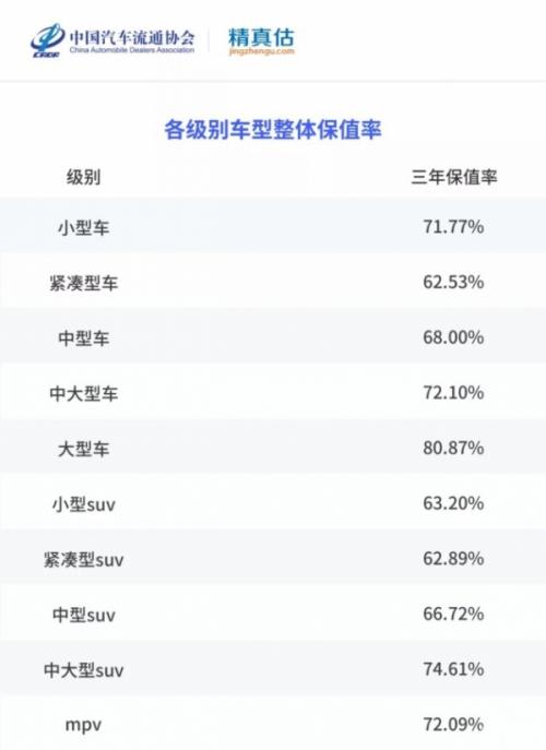 从不同级别的车型来看,小型车的三年保值率高达71.77%,紧凑级车为62.53%,中型车为68.00%;小型SUV三年保值率为63.20%,紧凑型SUV为62.89%,中型SUV为66.72%,中大型SUV为74.61%。