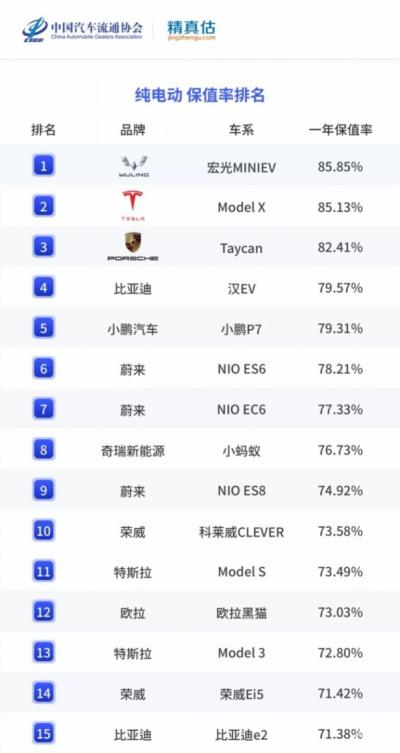 纯电动品牌方面,由于纯电动汽车的保值率受时间影响比较大,因此该报告看的是一年时间的保值率。具体排名上,五菱宏光MINIEV的一年保值率可以达到85.85%,特斯拉Model X也可以达到85.13%,保时捷Taycan为82.41%,比亚迪汉EV为79.57%,小鹏P7为79.31%。