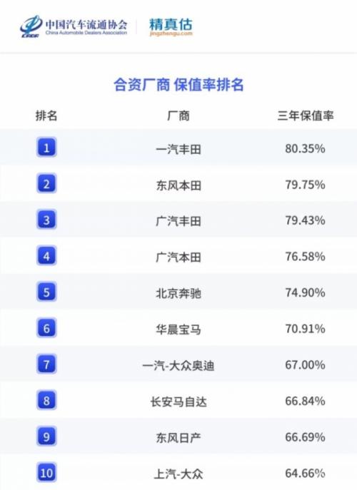 合资阵营方面,一汽丰田三年保值率高达80.35%,东风本田为79.75%,广汽丰田为79.43%。