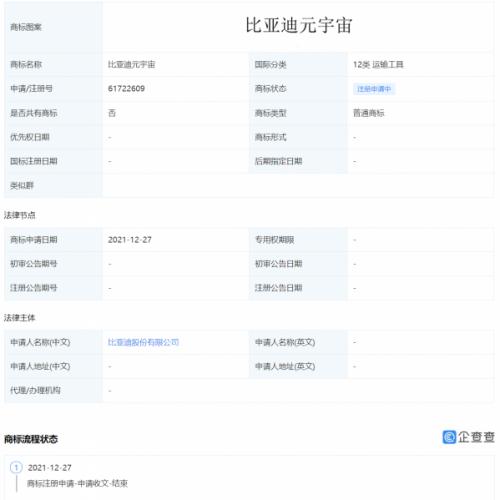 企查查App显示,近期,比亚迪股份有限公司申请注册了“比亚迪元宇宙”商标,注册号为61722609,国际分类为运输工具,目前商标状态为申请中。而根据相关资料,截止去年年底,国内已将有超过1.3万个名字中带有“元宇宙”的商标被申请,而这一数字在今年或将再创新高。