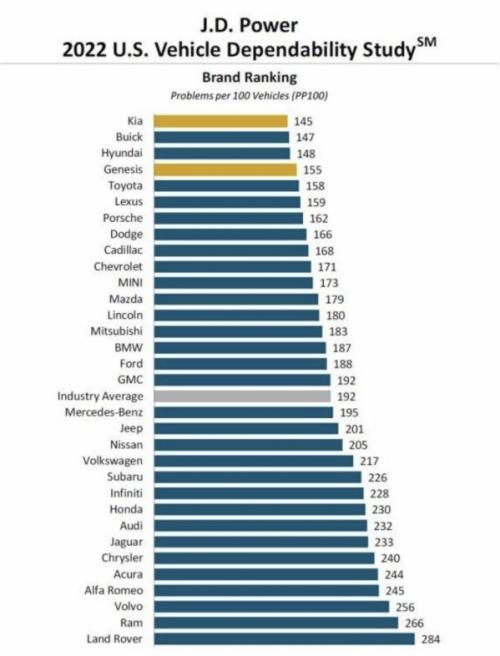 在购车的时候,汽车的可靠性成为人们做决定的一个因素。日前,智车派了解到,J.D. Power发布了2022美国汽车可靠性研究,列出了汽车品牌的可靠性排名。