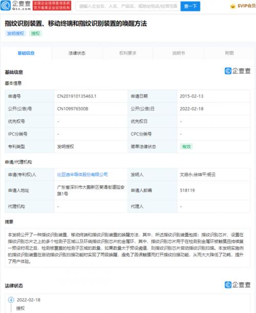 提到比亚迪,可能人们对它印象最深的都是其生产的汽车。其实除了汽车外,比亚迪还有着半导体和电池两大产业。企查查App显示,2月18日,比亚迪半导体股份有限公司申请的“指纹识别装置、移动终端和指纹识别装置的唤醒方法”获得授权。