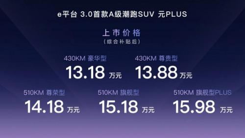 今天(2月19日),比亚迪比亚迪e平台3.0首款A级潮跑SUV――元PLUS正式上市,集潮跑外观、律动内饰、雷霆动力、潮玩空间、专业平台、刀片・安全六大核心优势于一身。新车共5款车型,售价13.18万元起。
