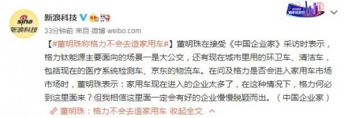 3月9日消息,格力集团董事长董明珠在接受媒体采访时表示,格力不会进入家用车领域,“家用车现在进入的企业太多了,在这种情况下,格力何必到这里面来?但我相信这里面一定会有好的企业慢慢脱颖而出。”
