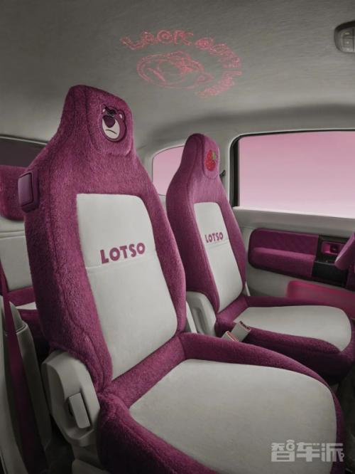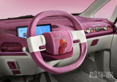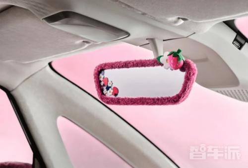 内饰设计与外观保持一致,中控和方向盘处大面积采用“草莓熊粉”新潮配色。舱内一体式包裹座椅、车门扶手、车内后视镜沿等以毛绒材质包覆,营造出“草莓熊怀抱”的温暖感。按下“喇叭键”,星空顶上由草莓熊头像及特殊字母组成的轮廓灯随即亮起,提升了舱内的时髦气息。