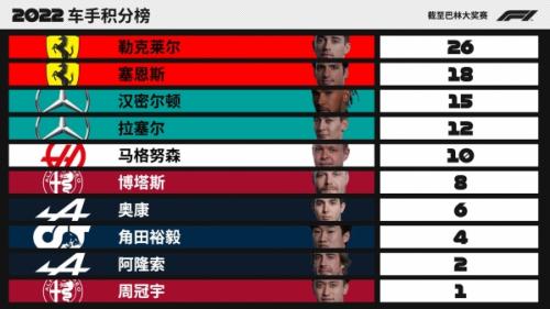 当前2022赛季F1车手积分榜
