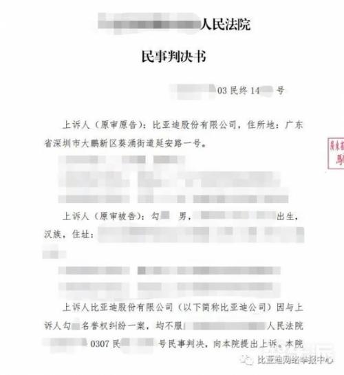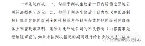 据比亚迪官方消息,2022年4月12日,就原审被告/二审上诉人勾*(今日头条用户“反比亚迪传销集团范董”,账号已注销)在网络发布数篇不实言论,针对比亚迪公司进行侮辱、诽谤、严重侵害比亚迪名誉权一事,经法院二审审理后认定,原审被告/二审上诉人勾*已构成对比亚迪公司名誉权的侵犯,须赔偿比亚迪公司经济损失3万元,同时在《中国法制报》或其它同级别全国性报纸与今日头条或其他同级别网络媒体上刊登致歉声明。